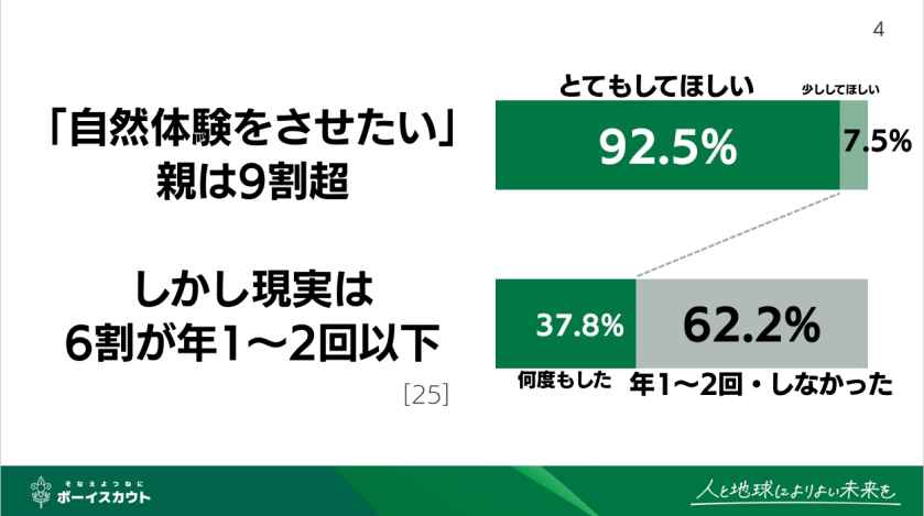 「公益財団法人ボーイスカウト日本連盟:ひとり親家庭における体験格差白書2025」によると、「子どもに体験をさせたい」と願うひとり親家庭の保護者は9割を超えています。しかし現実は、その6割が年1~2回以下にとどまっています。