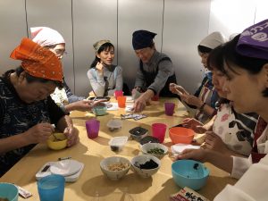 麹のチカラで大豆が味噌になる過程、味噌の種類や歴史、体への効果など熱い大豆愛を語る吹留さん。種類の違う味噌の試食をはさみ、味噌や大豆にちょっと詳しくなったところで、さっそく味噌玉づくり開始です!