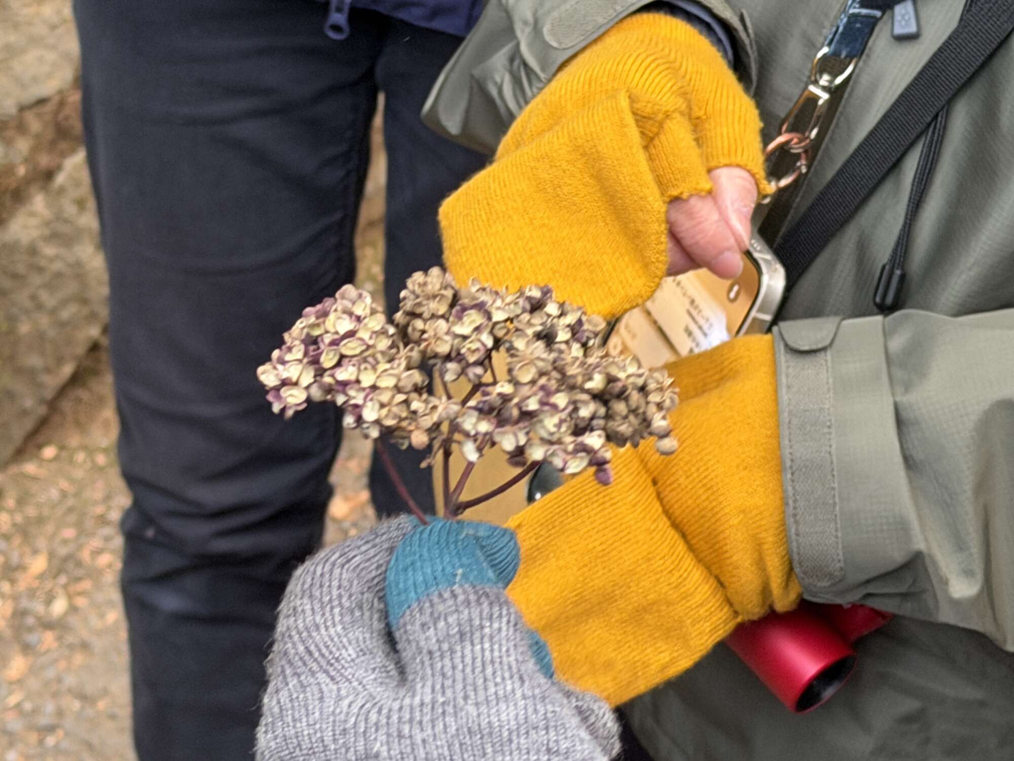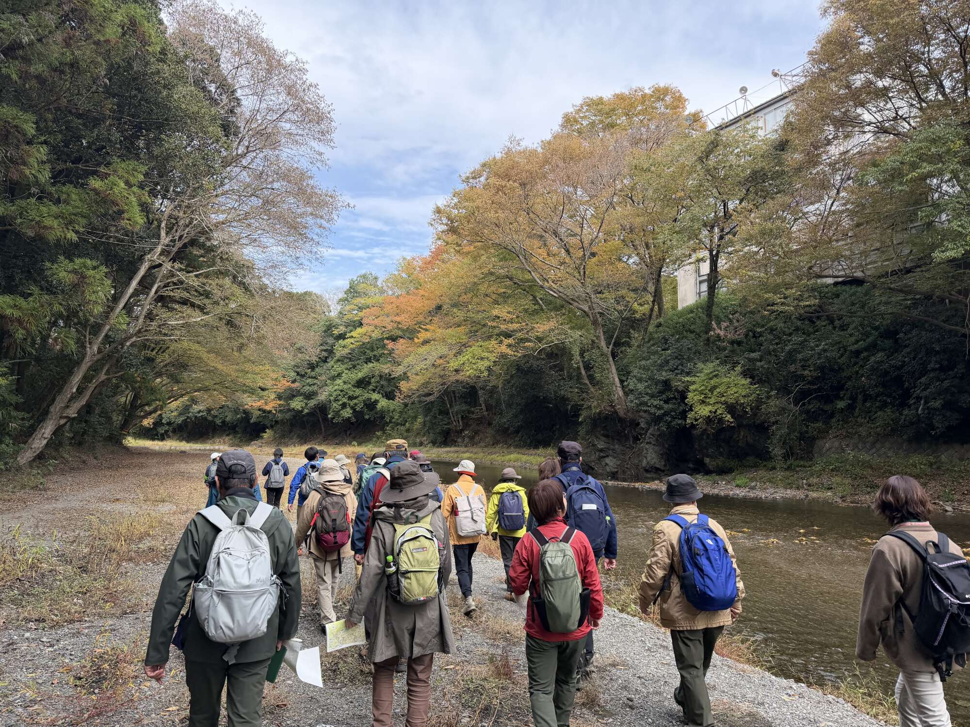 この日は秋晴れの空の下で、埼玉県飯能市のシンボルである名栗川と天覧山の周辺で自然観察を楽しみながら、雑木林の大規模開発の歴史とそれに対する市民の活動についてお話を伺いました。講師の浅野さんからは、地域の自然を大切にしたいと願う人々の思いが一つになったことが、大規模開発を喰い止める大きな力になったことが理解でしました。また守る会がナショナルトラストにより保全管理している、名栗川沿いと天覧山周辺の雑木林と田んぼでは、自然観察指導員を務められている大石さんのご案内で、晩秋の草花や生き物たちの自然観察を楽しみました。現在は保全した地域を、環境教育やエコツーリズムの場として幅広く活用される様に、飯能市とともに活動を進めているそうです。