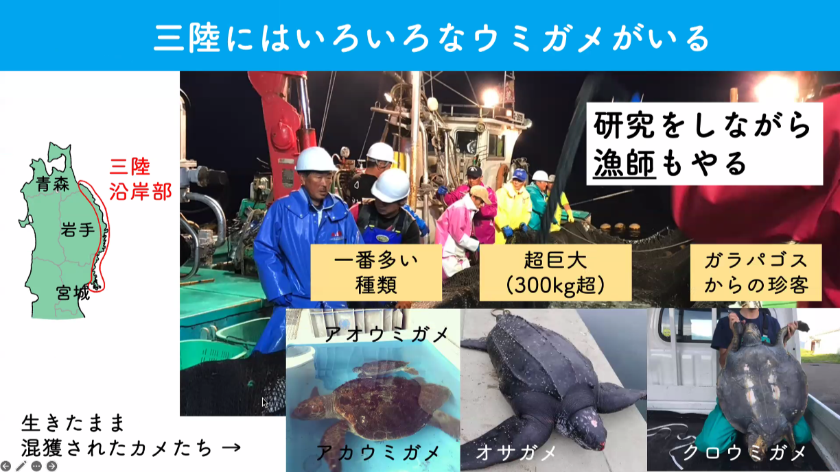 なんと、漁師さんの網にたまたま捕まってしまったウミガメを調査したそうです。