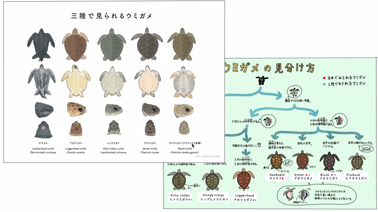 今回、子どもたちに送ったグッズの一つは「ウミガメ見分けシート」。素敵なイラストはもちろん、きのしたさんによるものです。