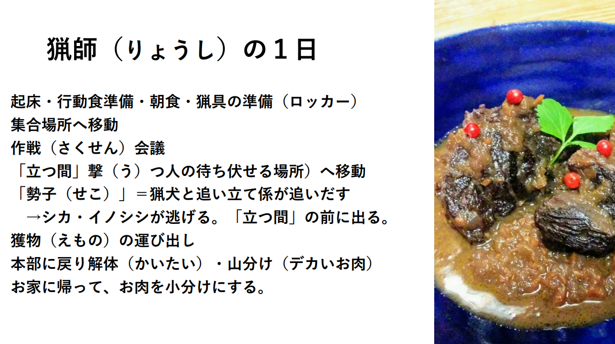 また、11月から2月に行われる犬と協力して行う「巻き狩り」という猟の1日についてもお話がありました。