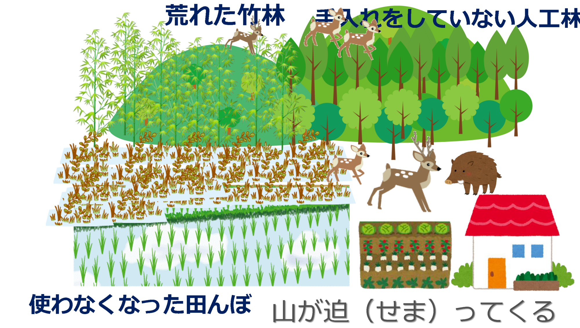 都市化を原因に使われなくなった田んぼによってあたりが野原になり、さらに人の手が加わらないことで荒れた竹林や人工林が増えることによって、山が人間の家の側まで迫ってくるのです。