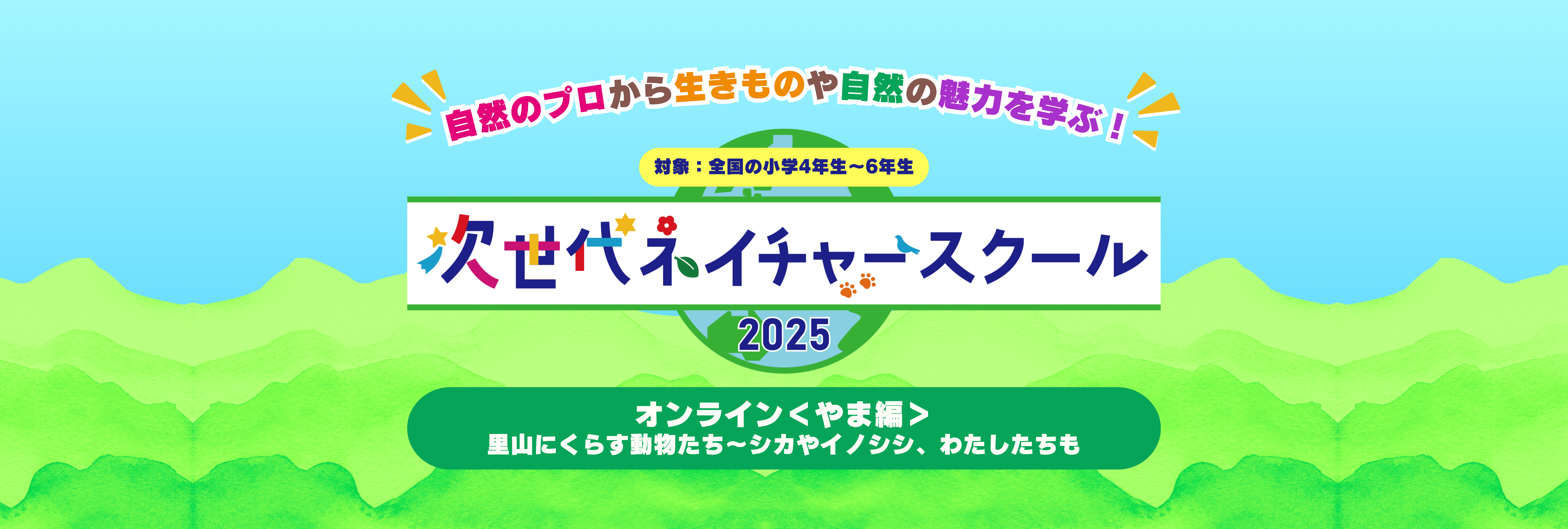 次世代ネイチャースクール2025では、オンライン講座の【やま編】と【うみ編】、2泊3日の宿泊プログラムを実施しています。