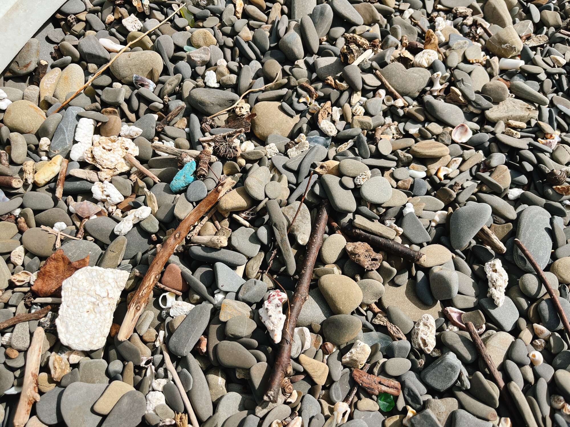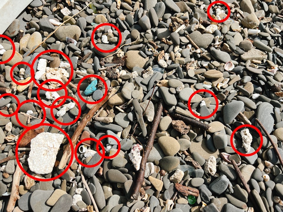 大きなごみをどかすと、石の隙間に発泡スチロールの欠片が入り込んでいます。下の写真の中で、どこに発泡スチロールがあるかわかりますか?