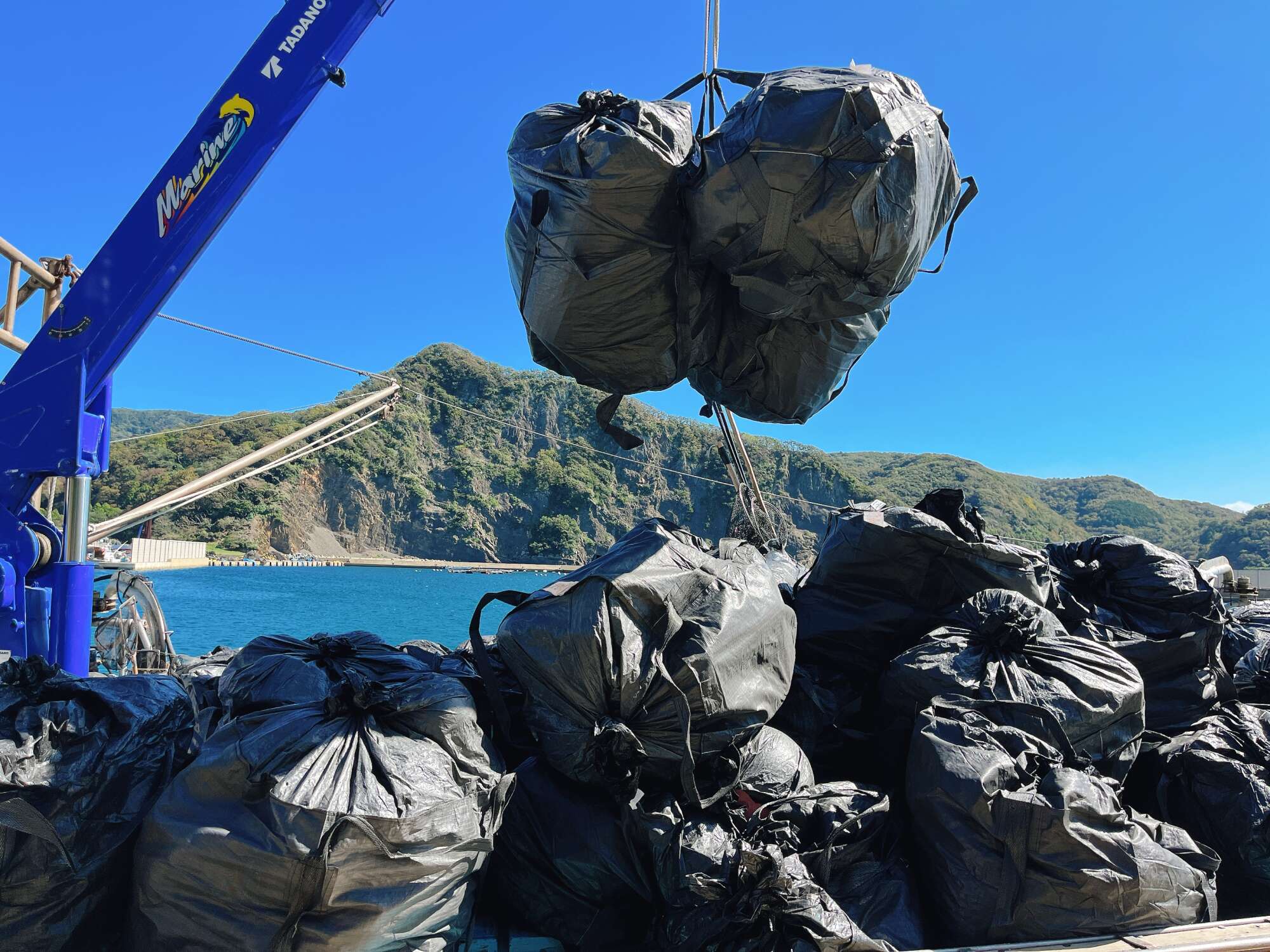 今回船を出してくださったのは、対馬で3代にわたって定置網漁を営む豊田水産合同会社さん。袋を運んでくださっているインドネシア人の技能実習生の方が、ごみの中からインドネシアで販売されているペットボトルを発見して驚いていました。