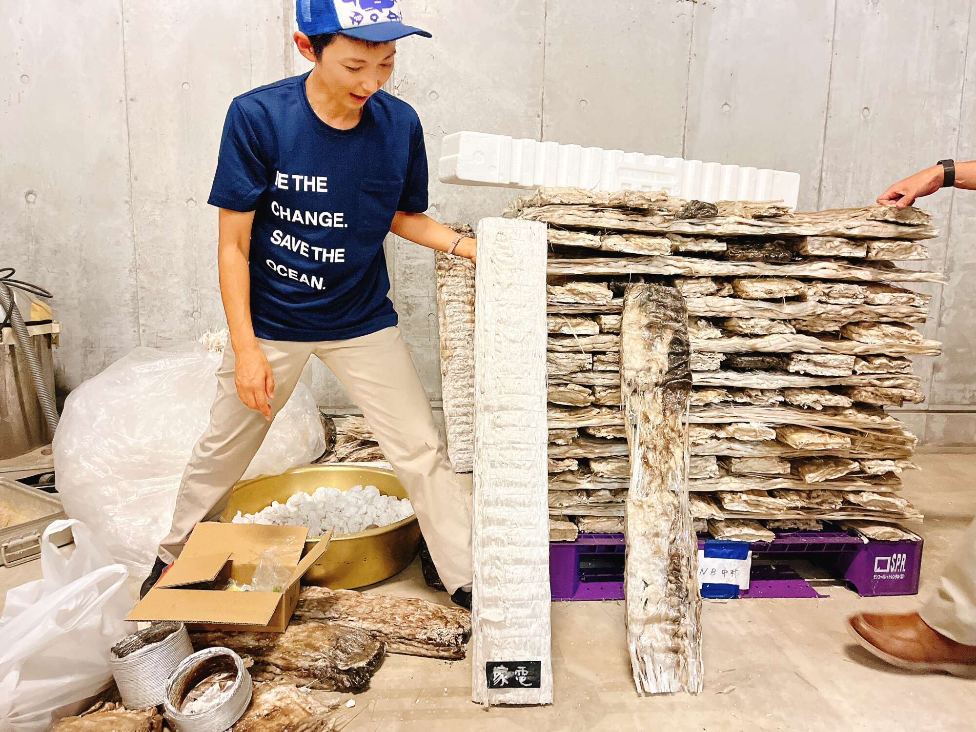 発泡スチロールを熱で圧着して素材として企業に販売するための機械も見せていただきました。が、左側が新品の発泡スチロールからつくられたもの、右側が海から回収された発泡スチロールで作られたもの。明らかに品質が違います。