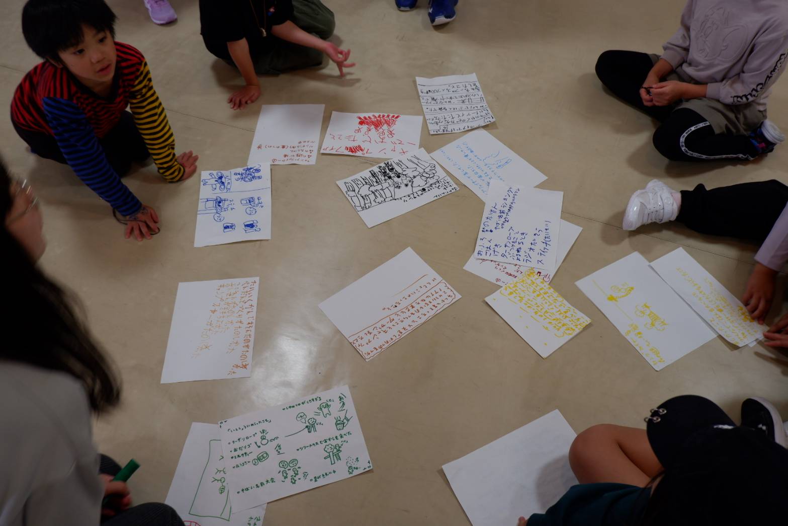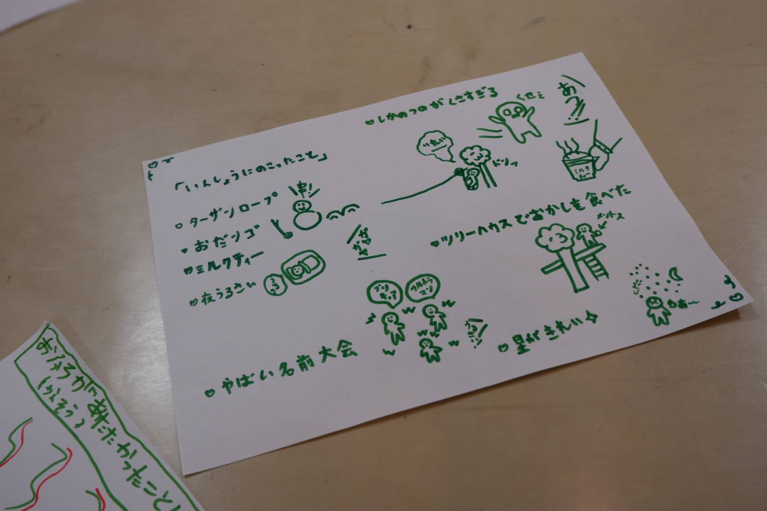 少人数グループに分かれて、「あんなことしたね」「こんなこと楽しかったね」と、2日間で印象に残ったことを絵や文章で共有していきます。