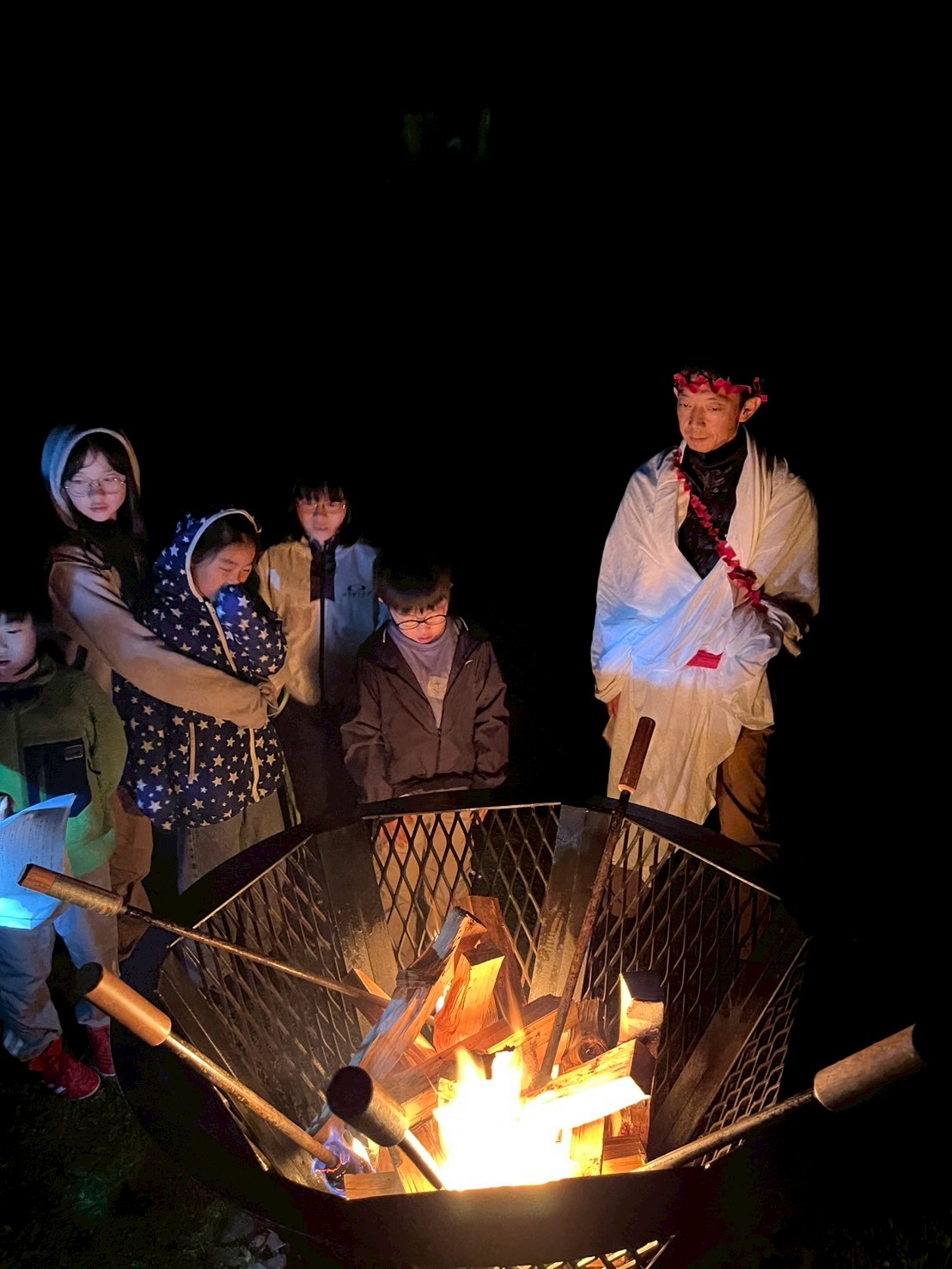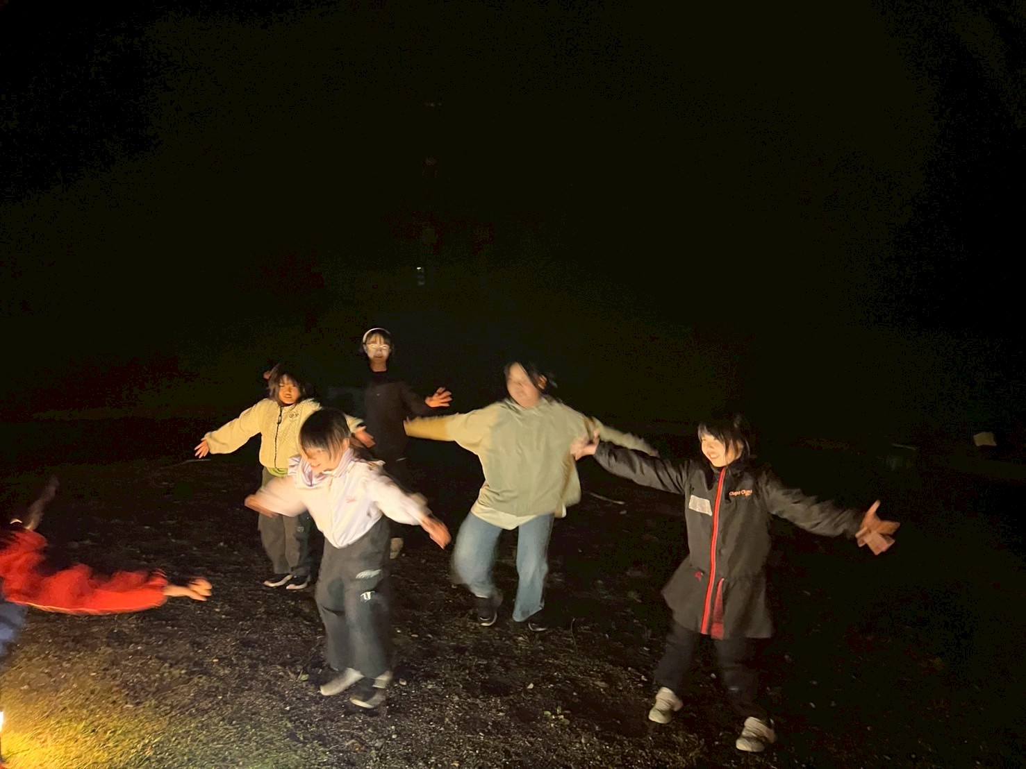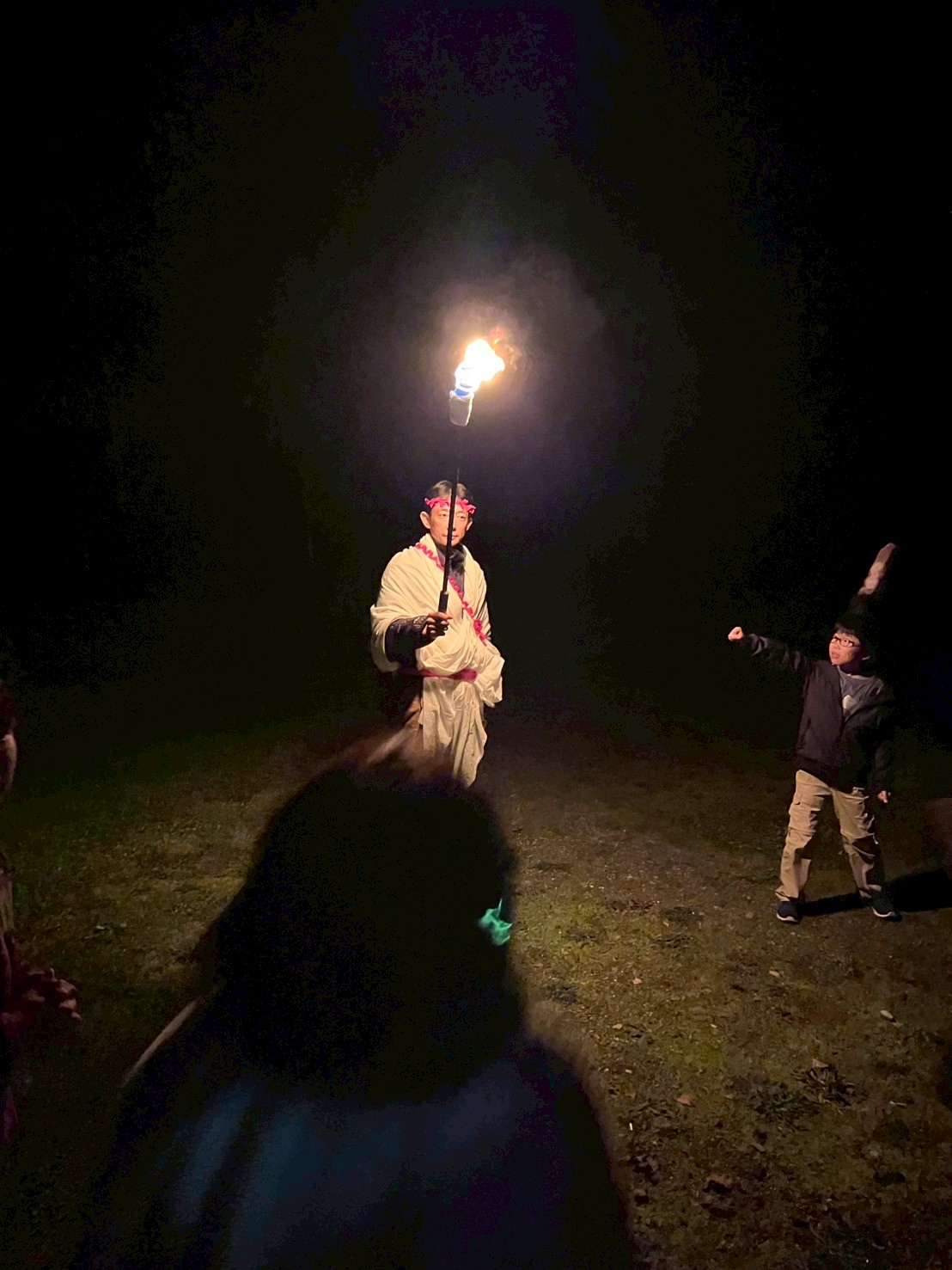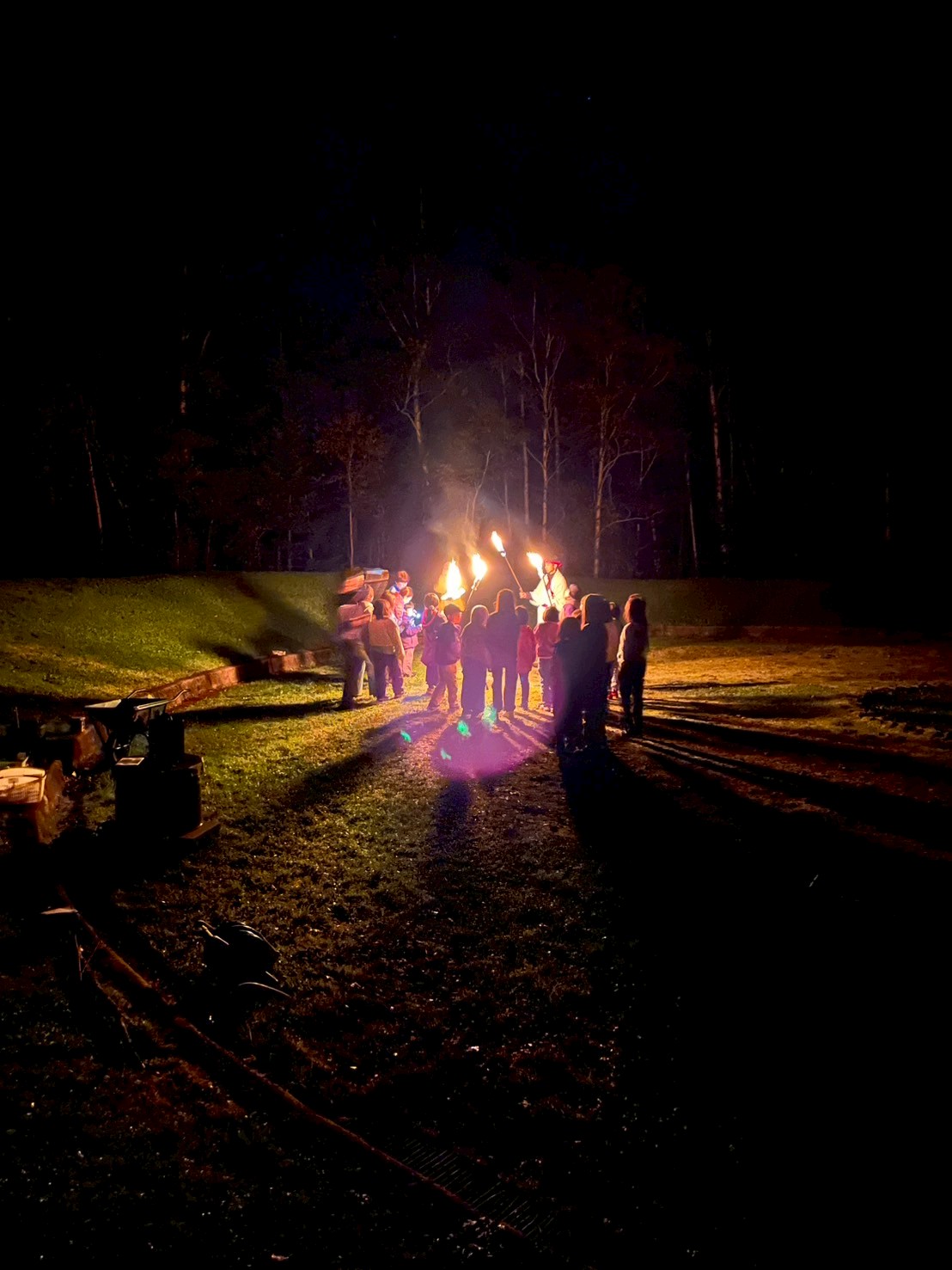 真っ暗闇の森の中をとおり抜け、キャンプファイヤーの会場地へ向かいます。