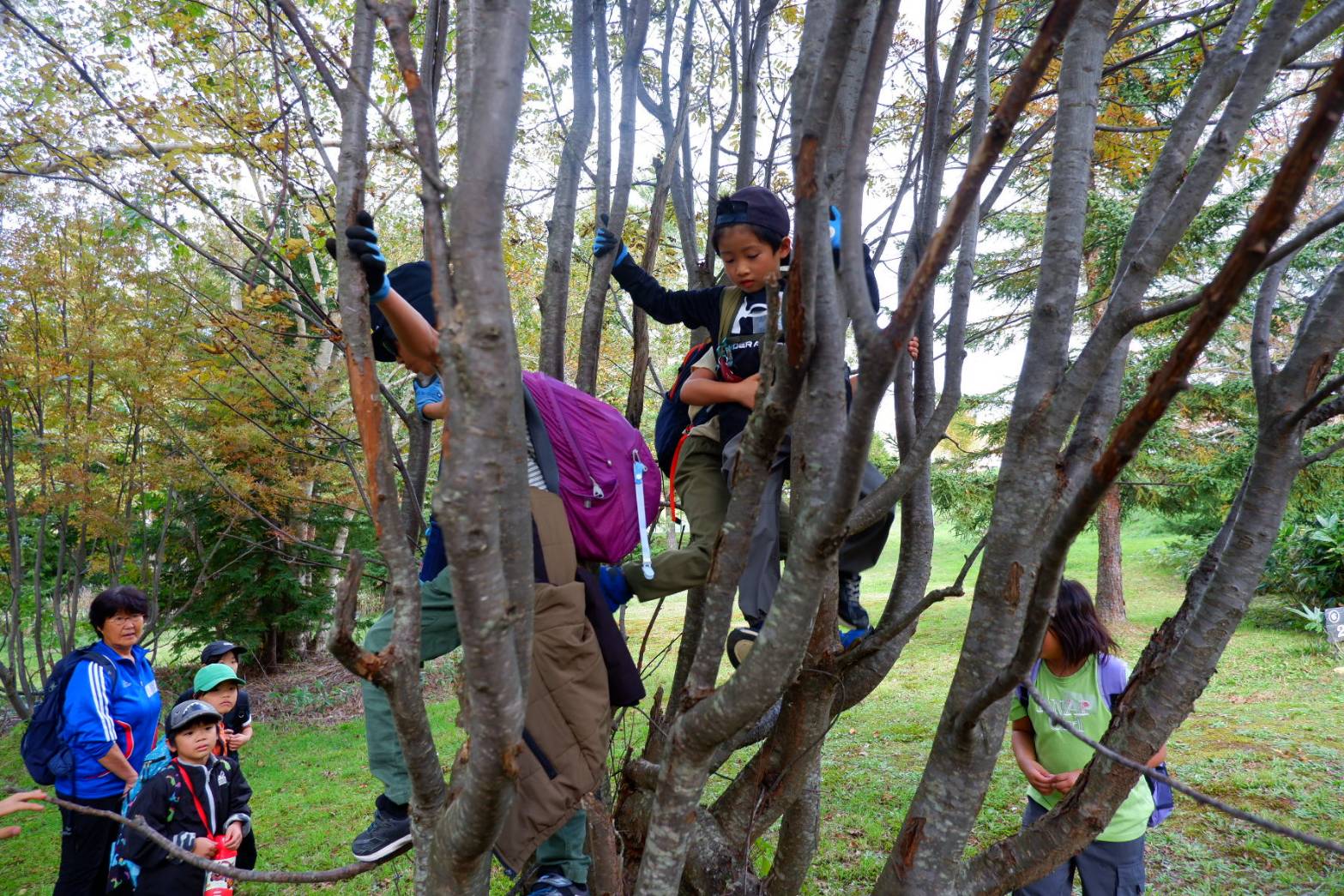 途中で不思議な形の木をみっけ。思わず登り始めるこどもたち。
