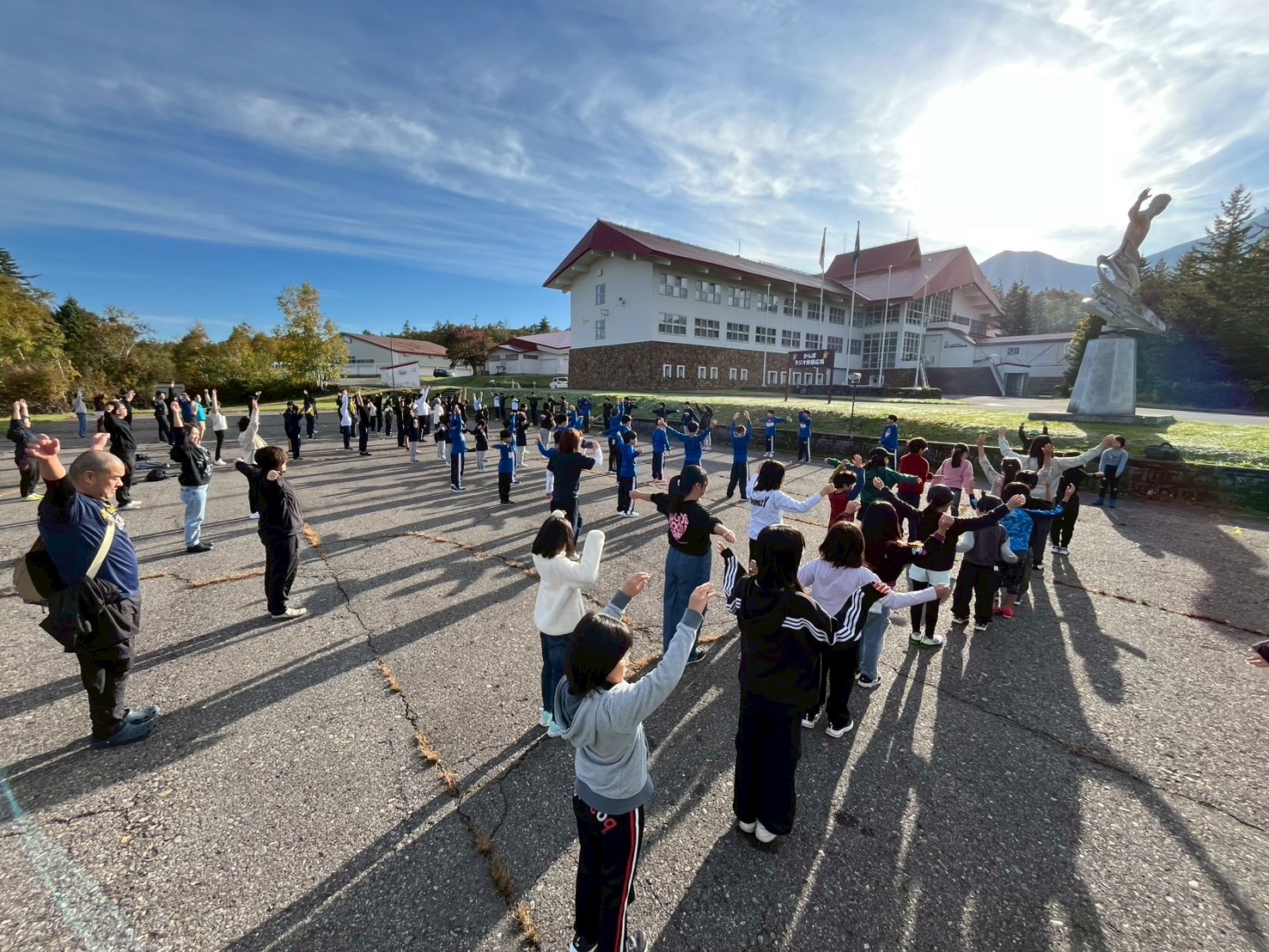 国立大雪青少年交流の家」に宿泊している他の団体さんも全員一緒にラジオ体操。スポーツ少年・少女のお兄さん、お姉さんに負けじと全力で体を動かします。この日は外でのラジオ体操が今年度最後とのことで、貴重な秋晴れの中でのラジオ体操でした。