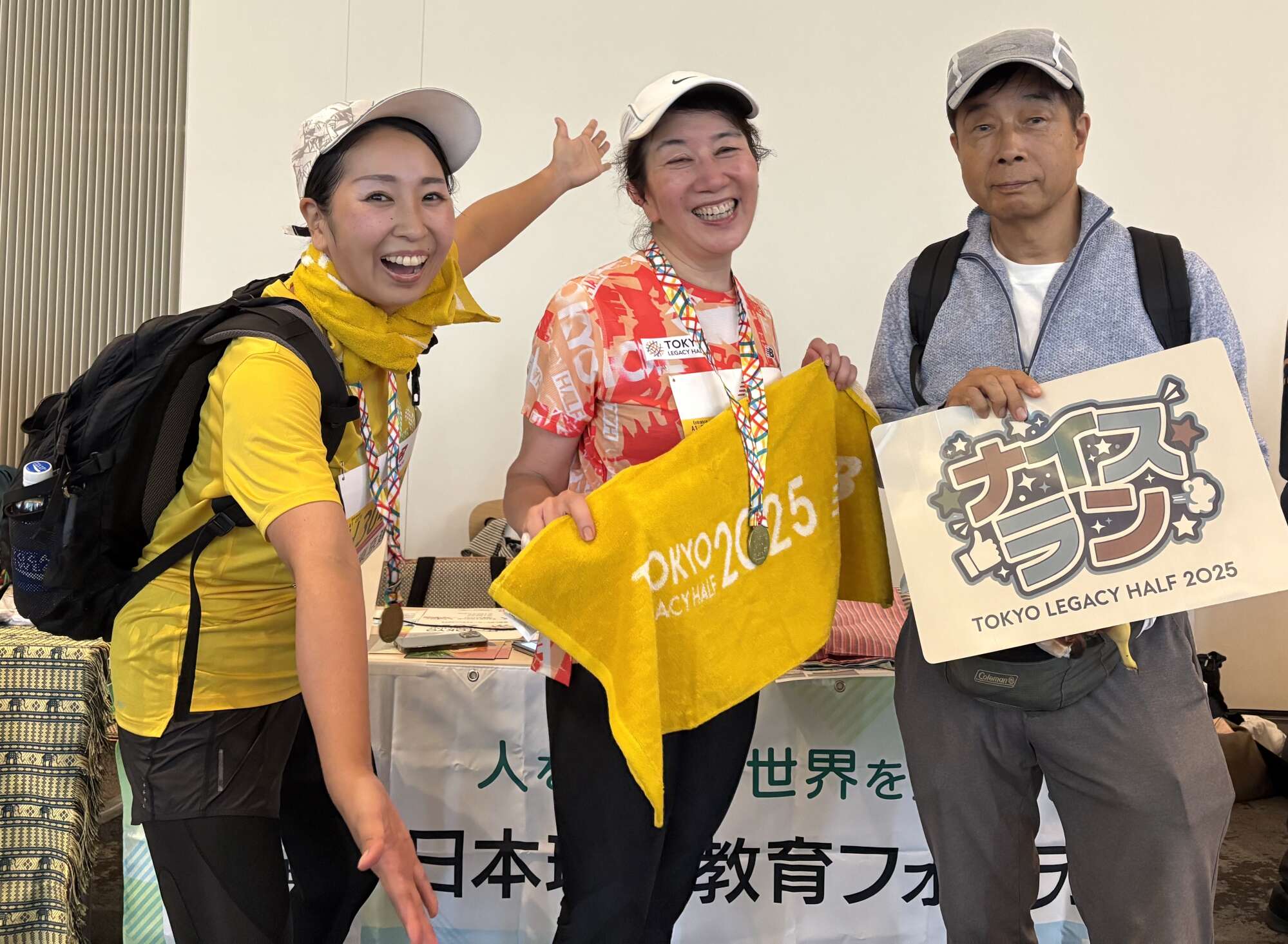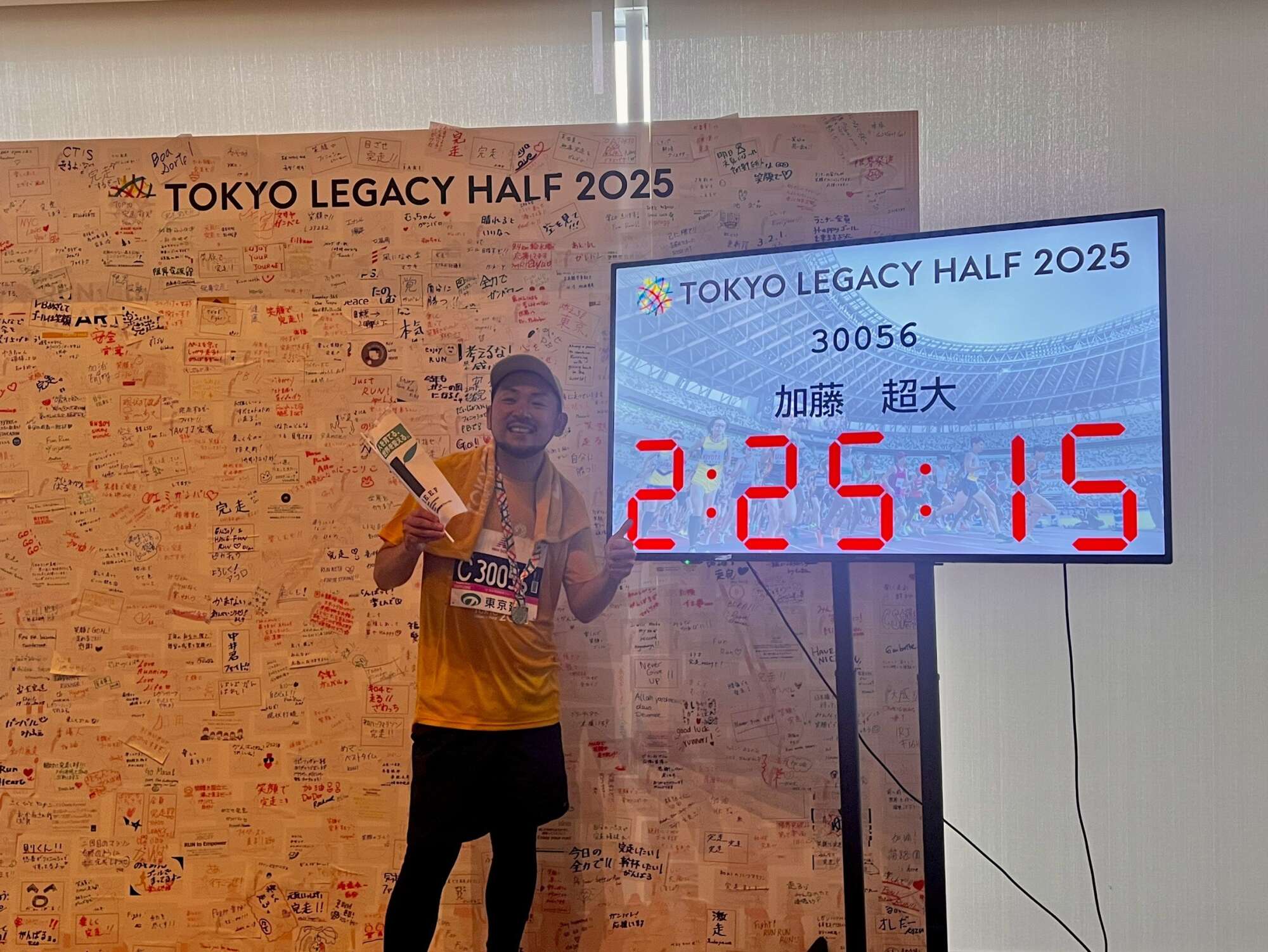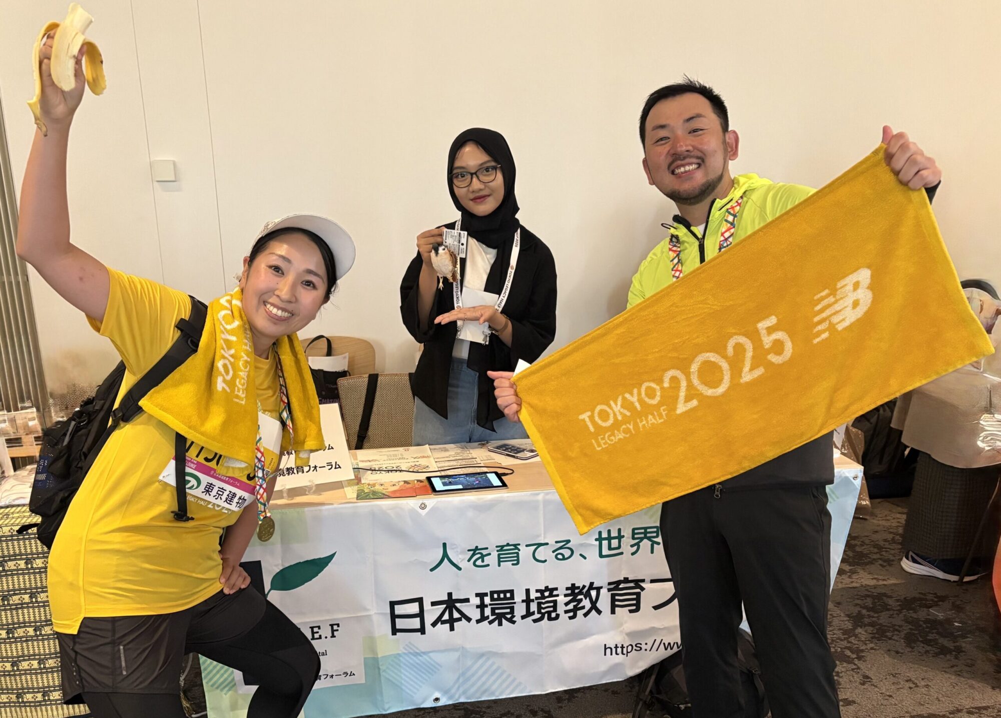 ついにJEEFのチャリティランナーの皆さんが戻ってきました。私とJEEFの職員の方は完走されたランナーの皆さんにJEEFのグッズをお渡しし、ランナーの方々は当日の走行タイムが表示されたモニターの前で記念撮影をされました。首には完走メダルをかけ、とても誇らしげで格好良い姿が印象的でした。
