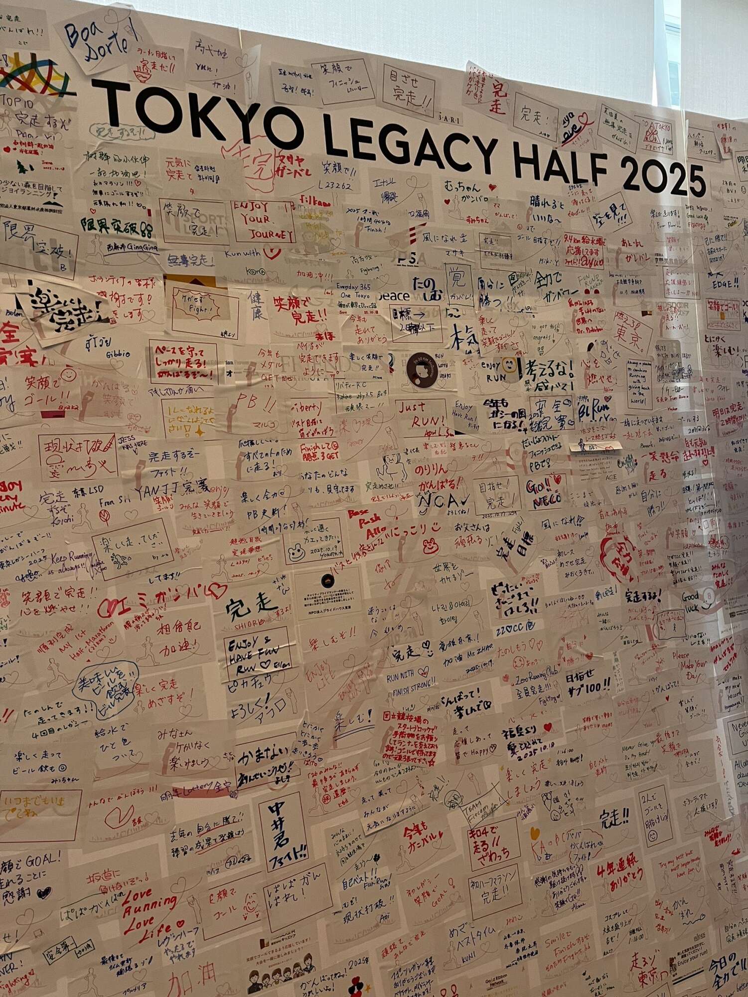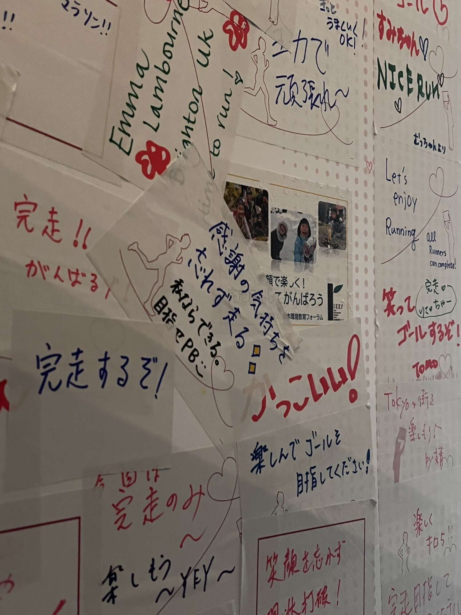 午前10時頃、他の寄付先団体のチャリティランナーの方々が次々とチャリティラウンジに戻ってきました。そのたびに、チャリティラウンジ内の全員が立ち上がり、「お疲れ様です!」「おめでとうございます!」と声をかけながら拍手で迎えていました。戻ってきたチャリティランナーの方々がだんだん多くなり、日本人だけでなく、多くの外国人ランナーも参加していることに気づきました。戻ってきたランナーの中には家族と一緒の方も多く、完走した喜びが笑顔から伝わってきました。皆さんはそれぞれの寄付先団体ブースや、応援メッセージが書かれたボードの前で記念写真を撮り、この特別な瞬間を大切に残していました。その温かい雰囲気と達成感に満ちた光景を目にして、私はとても感動しました。