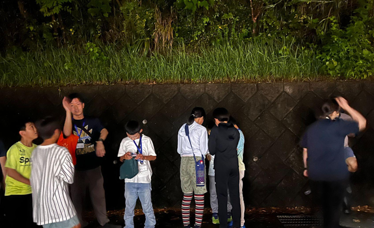 静まり返った森の中では、虫の声やフクロウなどの動物の鳴き声が聞こえ、夜ならではの自然の音に耳を澄ましました。さらに、暗闇の中で人間の目が持つ順応力の高さを実感する機会ともなりました。