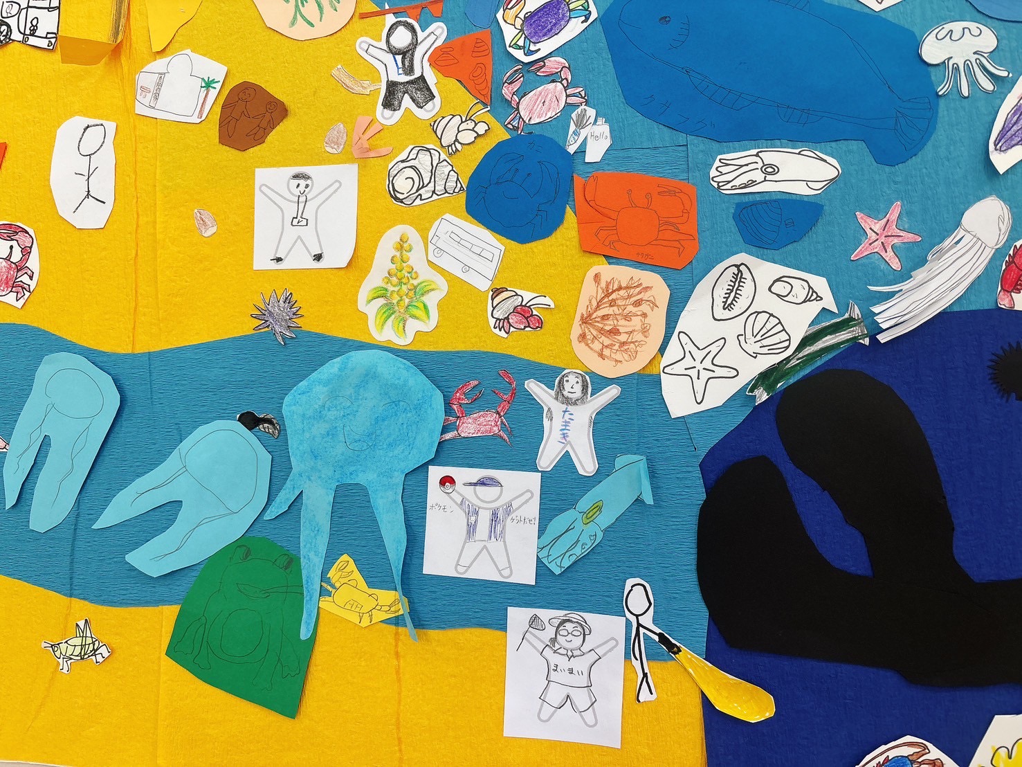 この2日間で出会った生きもの(動物や植物)を描いて、大きな森・里・川・海の地図に貼りました。