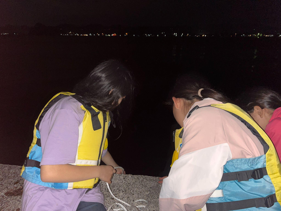 グループで協力しながら、真っ暗でせまい防波堤で釣りを行いました。エサを入れた小さなビンを海に入れ、約15分間そのままに待ちます。