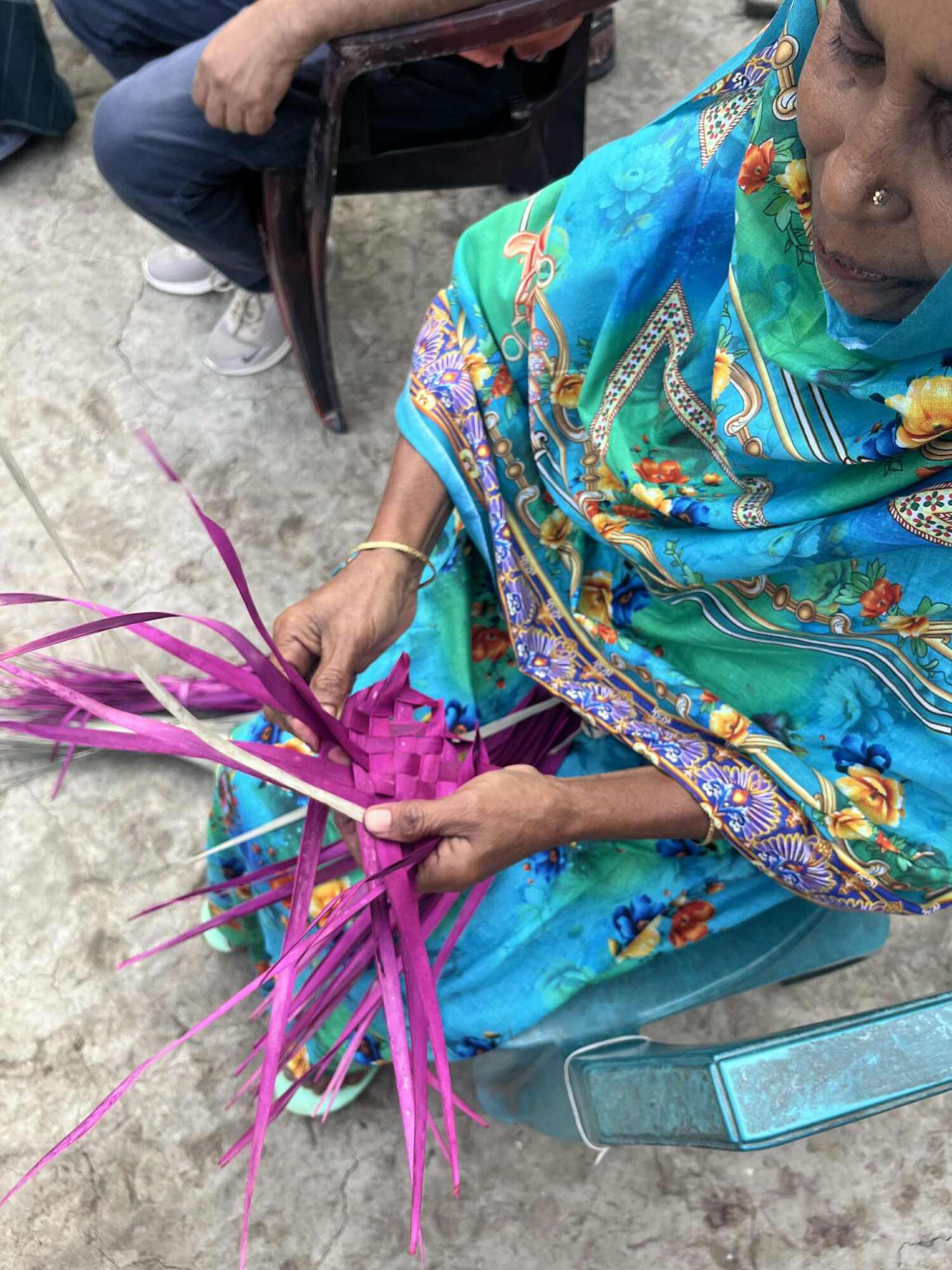 ヤシの葉を使ったゴザやカゴの作り方について研修を受けた女性たちは、家事の合間にせっせと練習中。