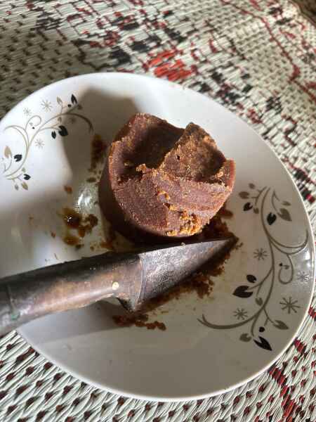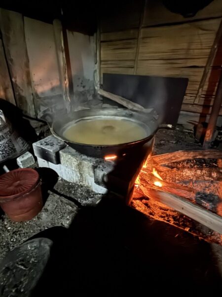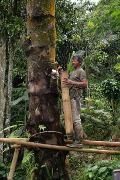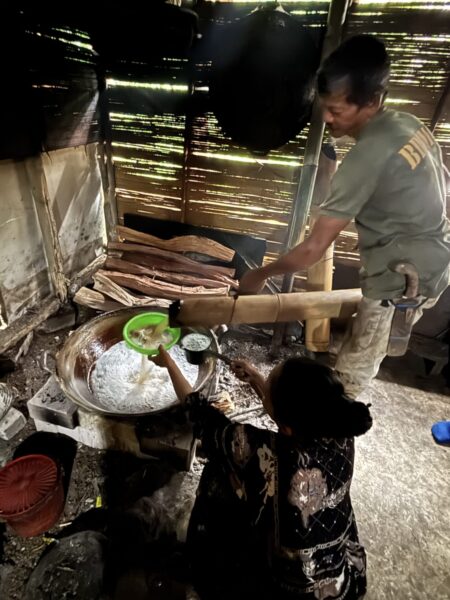 トレッキング後は、ビジターセンター建設が進むシジャグル集落へ移動し、ヤシ砂糖の製造工程を視察しました。村内で消費されるヤシ砂糖は、樹液の採取から煮詰めまで、すべて手作業で行われています。完成したヤシ砂糖を味見させていただきましたが、これがまた優しい自然な甘さで、インドネシアコーヒーによく合うんです!