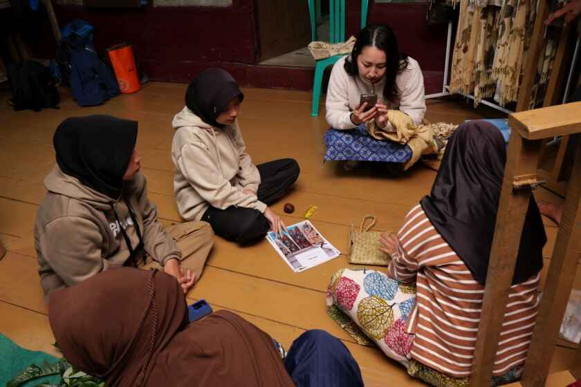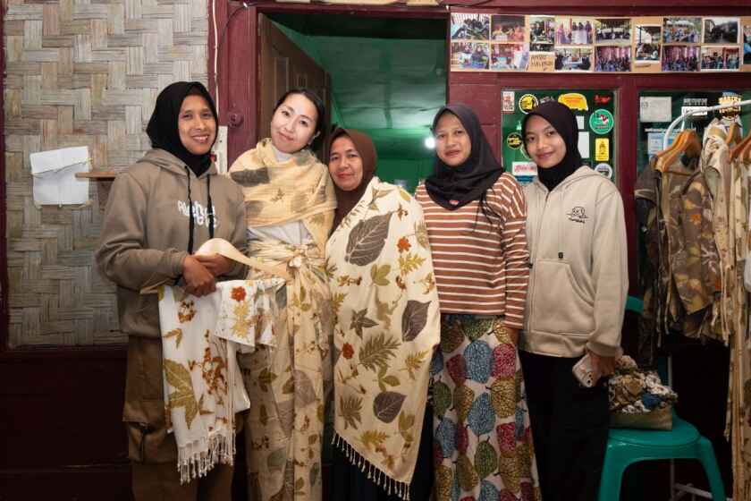 その後、村内の草木染めによるエコプリント製品を手がける女性グループ 「Ambu Halimun」 と意見交換を行いました。Ambu Halimunは、2021年に活動を開始した女性グループで、布への草木染め(エコプリント)を通じた収入創出に取り組んでいます。都市の先行団体から技術指導を受け、現在では製品販売やワークショップ実施までを自立的に行う体制が整いつつあります。