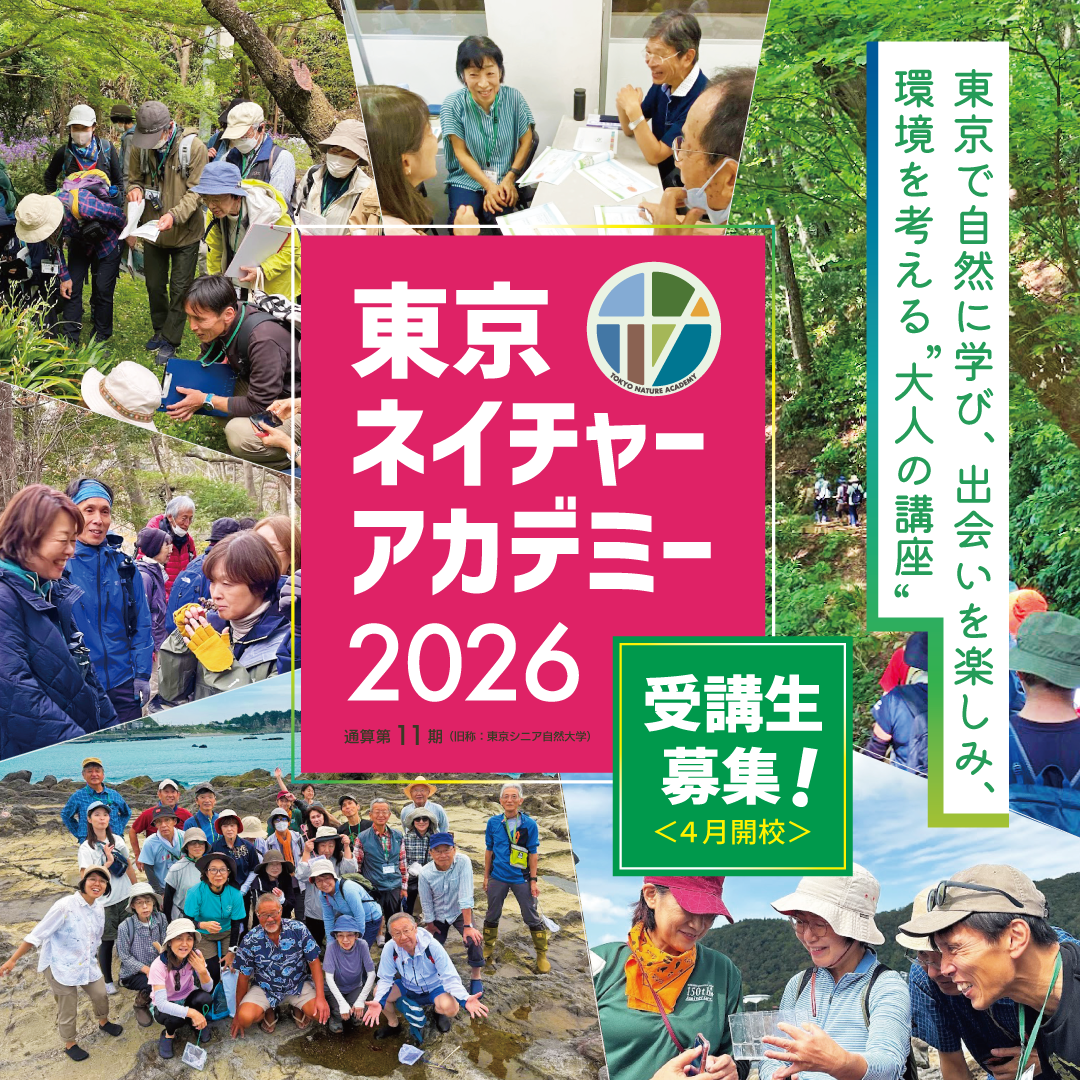 自然や環境について関心を持つ仲間と出会い、共に自然に親しみ自然に学び、できる範囲で自然環境保全の一助となる活動を継続していくことを目指しています。四季折々の自然とふれあいながら、自然についていろいろと学べる講座で、野外講座やワークショップが多いのが特徴です。身近な自然、小さな生きものの中に、たくさんの不思議を見つけてください。東京にも自然はたくさんあります。自然が大好きな新たな仲間とも出会え、特にシニア層に人気の講座です。