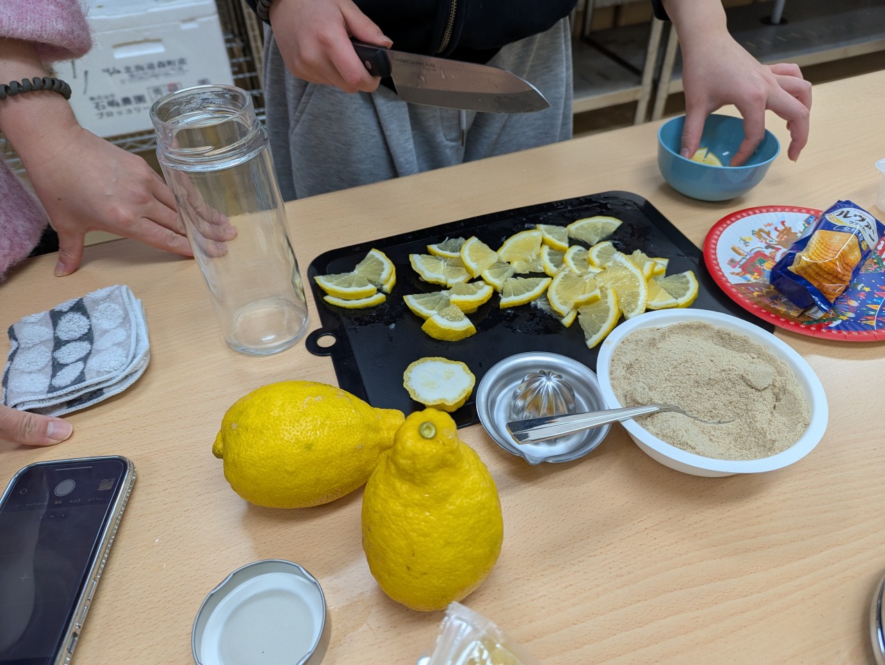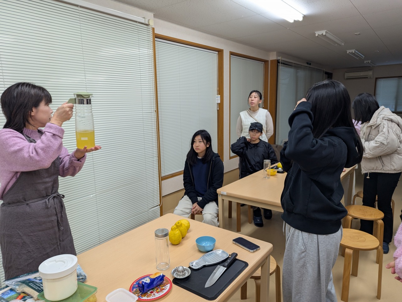 収穫作業を終えて公民館に戻り、地域協力者の田辺さんと山本さんの2名からレモンの酵素ドリンクとレモンバターの作り方を教えてもらいました。2人は地域の飲食店で働いていることもあり、知識も豊富です。無農薬のレモンは貴重なので、皮ごと使えるレシピを教えてもらいました。