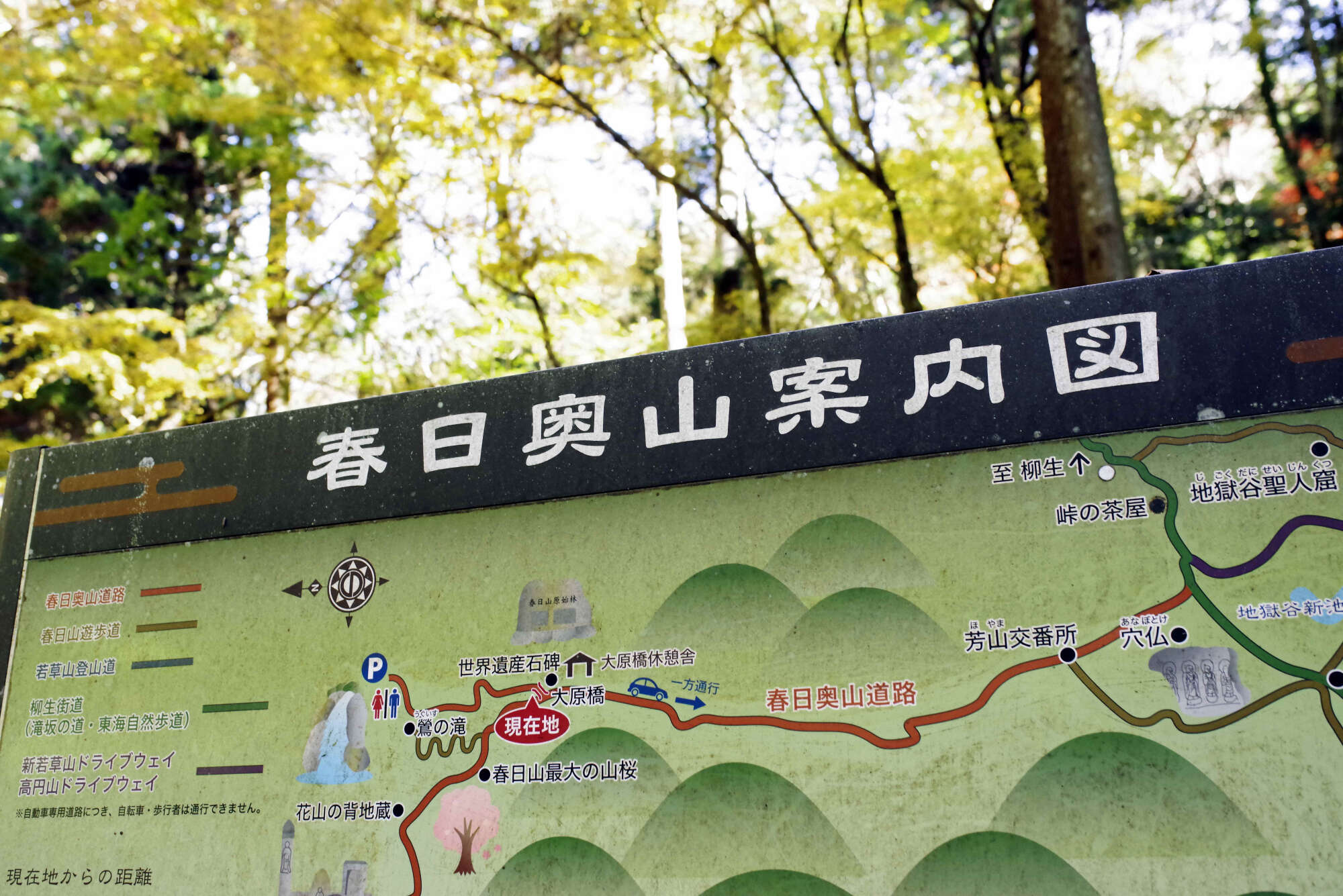 「原始林」の名が付く春日山ですが、実は自動車道があります。昭和初期に周遊自動車道が整備され、現在でもその一部が有料道路となっています。道路開発については、整備当初も反対運動があり、その後も一部が自然保護運動により通行止めになるなど、賛否については、さまざまな考えがありますが、個人的には道路の開発による森林生態系への影響は現在までも尾を引いているのではないかと感じています。関わり始めた頃は、この道を通行止めにすべきとも考えていましたが、一方で、自動車で訪れることのできる1000年の森と考えると、誰もが訪れることのできる場所であるということにも気がつきました。