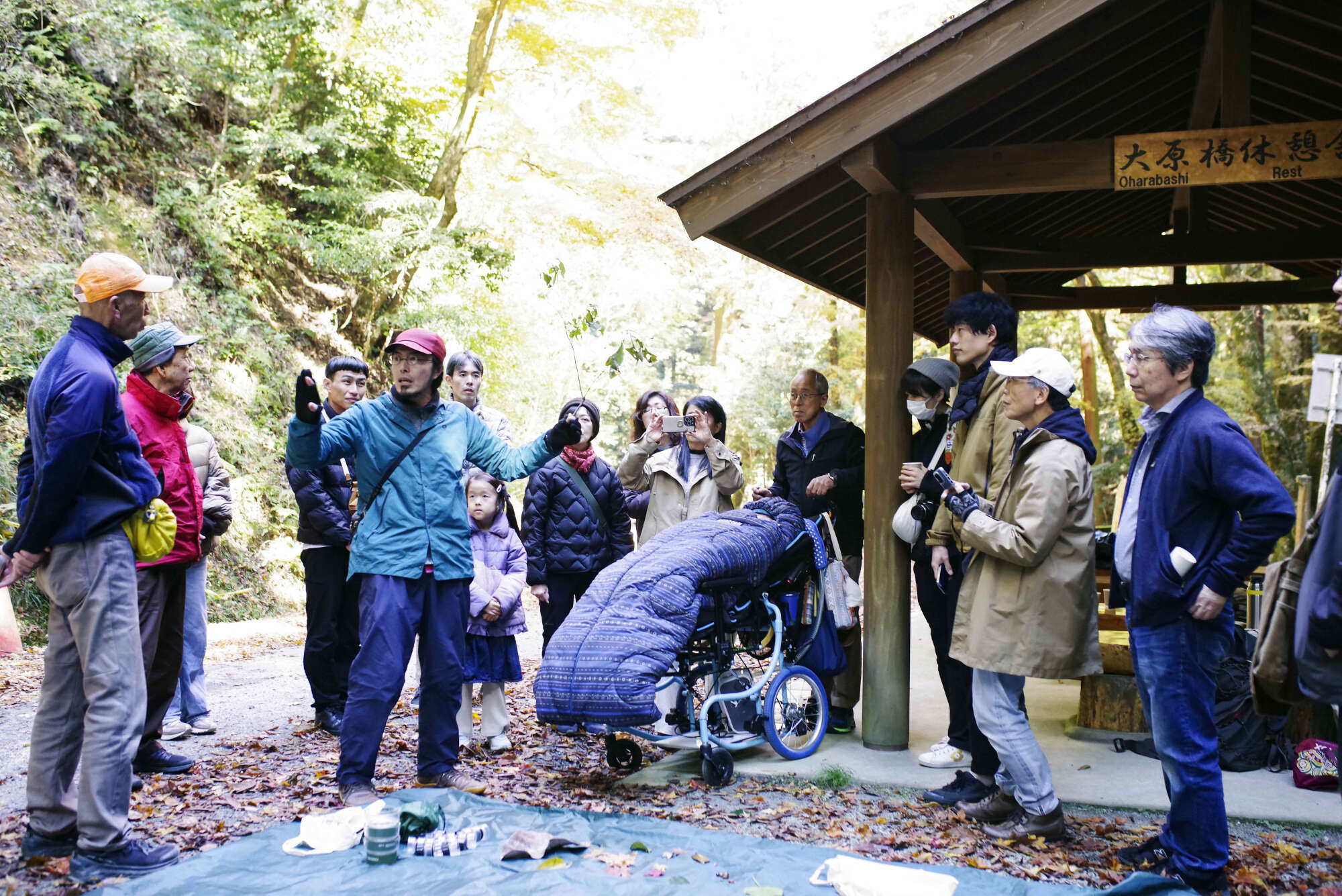 冒頭に駐車場から少し歩いた場所の紅葉を見るために移動します。車椅子を中心にみんなでワイワイと歩き、春日山の常緑広葉樹の間に指すイロハモミジの紅葉を見てもらいながら、春日山原始林という森について簡単に説明し、森の空気や、音、手触りなどを楽しんでいただきたいとお伝えしました。