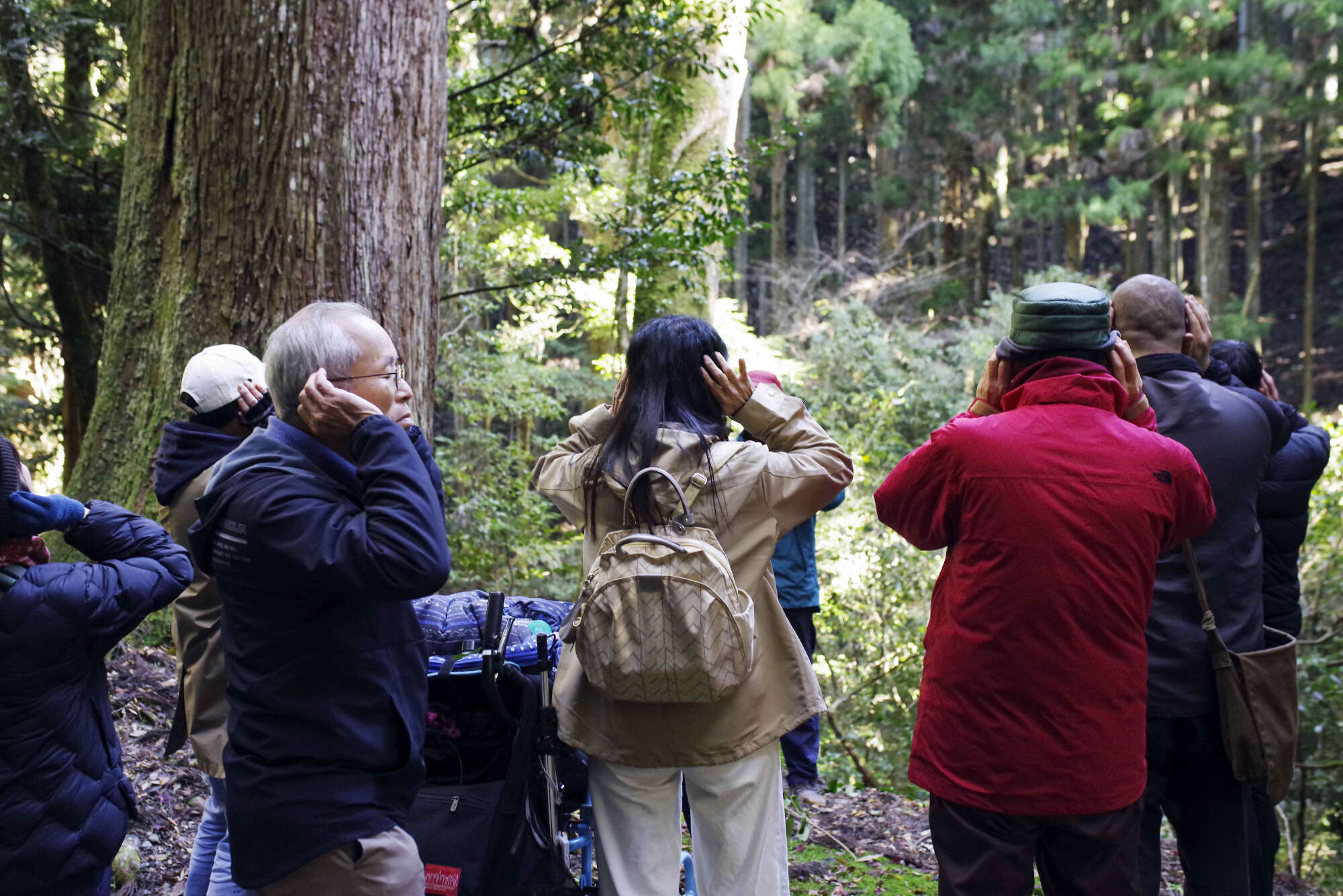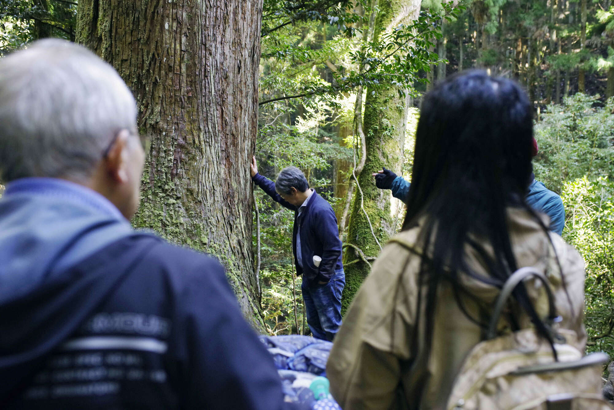 その後、ほんのちょっとだけ森を散策。100mほど先の杉の大木まで移動し、樹齢200年程度のスギに触れていただいたり、周辺の音に耳を澄ましてみたり。ささやかな時間ではありましたが、森を感じて楽しんでいただく時間となりました。