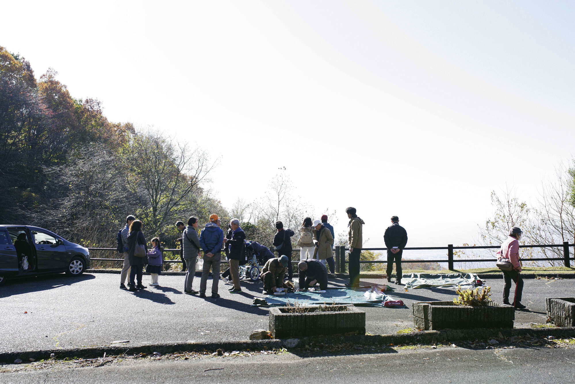 実施日となる11月30日(日)は、秋晴れの美しい1日となりました。春日山原始林は紅葉のピーク。若草山山頂の駐車場で参加者と合流。今回の参加者は、当事者の方とそのご家族3名と、主治医の先生や看護師の方々の10名。運営側は、東大寺レスパイトハウスのスタッフ(ここには東大寺の僧侶の方も含まれている)ボランティアの3名と私たち3名(運営サポート+カメラマン)です。