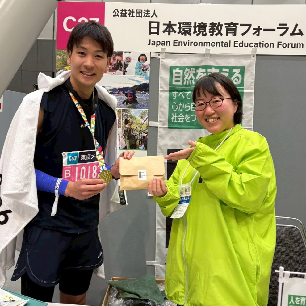 今回お会いできたJEEFのチャリティランナーの皆さんには、2025年の寄付金活用事業の活動報告 もお渡しし、感謝の気持ちを直接伝えることができました。スポーツを通じたチャリティの参加によって、現代のさまざまな課題を知り、社会貢献について考えるきっかけとなりましたら幸いです。チャリティランナーの皆さんには、日本の自然を感じられる返礼品をお渡ししました。