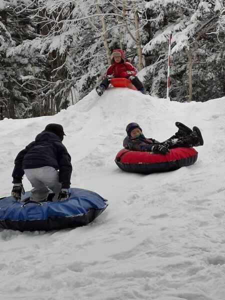 午後はいよいよ外遊びです。長距離ソリ滑りやチューブ滑りでは、「誰が一番遠くまで滑れるか」 を競い合い、何度も坂を登っては滑ります。