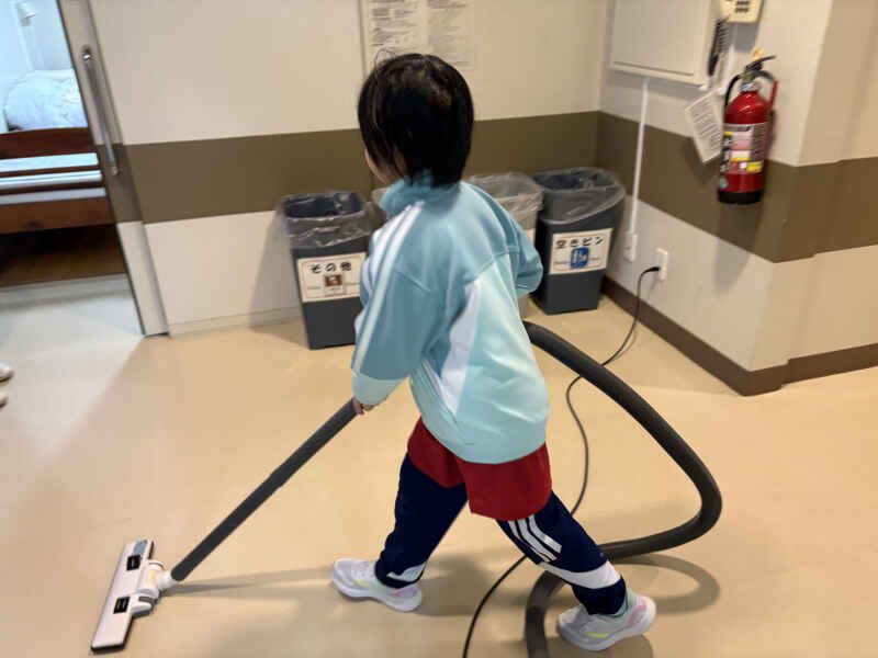 翌朝、起きるとすぐに掃除を始める子どもたち。 「早く外に行きたい!」という気持ちから、テキパキと作業が進み、予定より 30 分ほど早く準備 が完了しました。