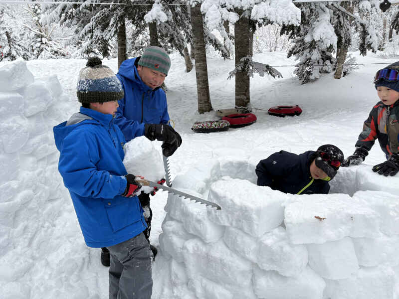 スノーソーを使って雪のブロックを切り出し、それをソリに乗せて運びます。 ブロックを一つずつ積み上げ、少しずつ壁ができていきました。
