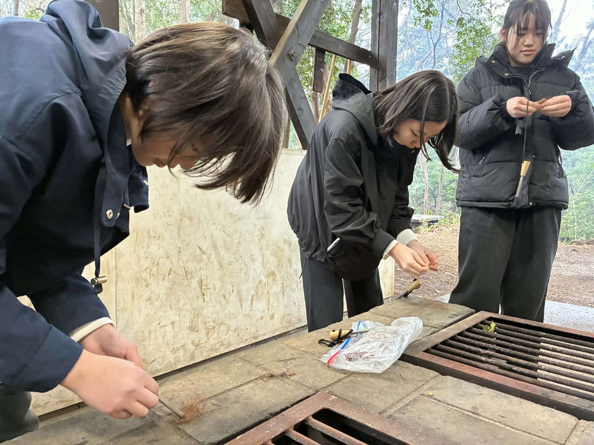 包丁で野菜やお肉を切り、薪で火起こしをして、カレーを作ったりお米を炊きました。煙で目が痛いのも我慢しながら一生懸命に調理をしていました。徐々に作業が減っていき、焚火の前にみんなが集合している姿は、微笑ましい時間でした。