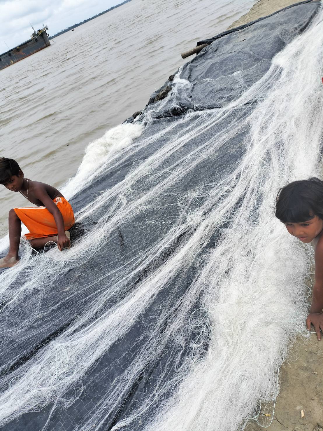 ▼(左)道中、漁網を拡げているこどもたちに会いました。(右)漁師さんのお母さんが作った漁網。