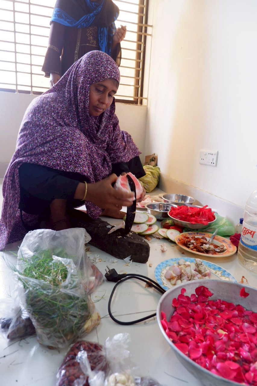 ノクシカタを制作する女性グループを訪問。職場は家から近く、20名ほどのグループで協力しながら作業をしていました。